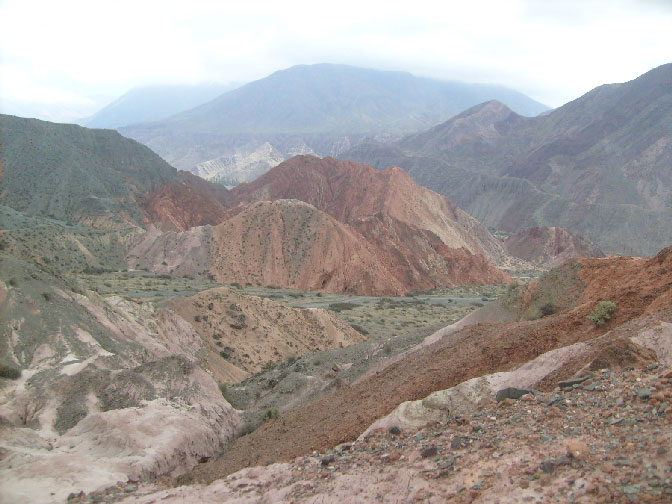 San Salvador de Jujuy, Purmamarca, Abra Pampa et Yavi à la frontière avec le Bolivie et descente vers Cafayate. Tout cet endroit s'appelle la Quebrada de Humahuaca, classée au patrimoine mondial de l'Unesco, c'est un ensemble de vallées minérales. Je découvre les premiers contreforts un peu avant d'arriver :