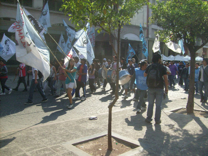Sinon autour de la place il y a encore de beaux bâtiments. En ce moment il y a beaucoup de monde qui arrive, c'est une période de fête religieuse, c'est la « Fiesta del Milagro » la fête du miracle car en 1692 il y a eu un violent tremblement de terre et Salta fut épargnée. Il doit y avoir des processions mais là c'est des manifestations politiques qui profitent de la foule pour revendiquer, manif assez sympa car en musique locale, flûtes des Andes, chants.