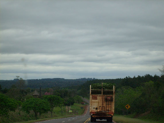 Je ne me suis pas trompé de route, c'est bien la bonne, et encore là ce n'est pas la saison des pluies et si il y a d'autre passages comme cela ça craint ….. mais en fin de compte je n'ai pas perdu ma journée car j'ai vu un couguar noir (dans le langage courant on dit une panthère noire, mais ici ce sont les couguars, nom donné par les guarani) qui traversait ma route en pleine forêt et comme je ne roulais pas vite j'ai pu en profiter. Mais pas de photo malheureusement, trop rapide pour moi … Retour sur la route goudronnée mais je sais bien que d'autre ripio m'attendent … un camion de maté .. c'est la cueillette ..