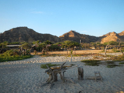 vue de la plage vers les bungalows. Cet endroit est recommandé dans les guides car le patron, Léon, espagnol d'origine en a fait un lieu écolo. l’hôtel Tres Puntas Ecological.